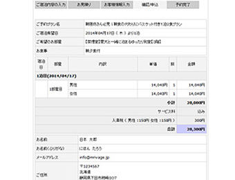 ご予約完了前の最終確認の画面です。お申し込みの入力内容、人数、料金、プラン内容などをご確認くださいませ。内容に問題がなければ「予約を確定する」ボタンで予約が確定になります。 ご予約確定後、お客様のご入力いただいたメールアドレスに申し込み通知が送付されます。